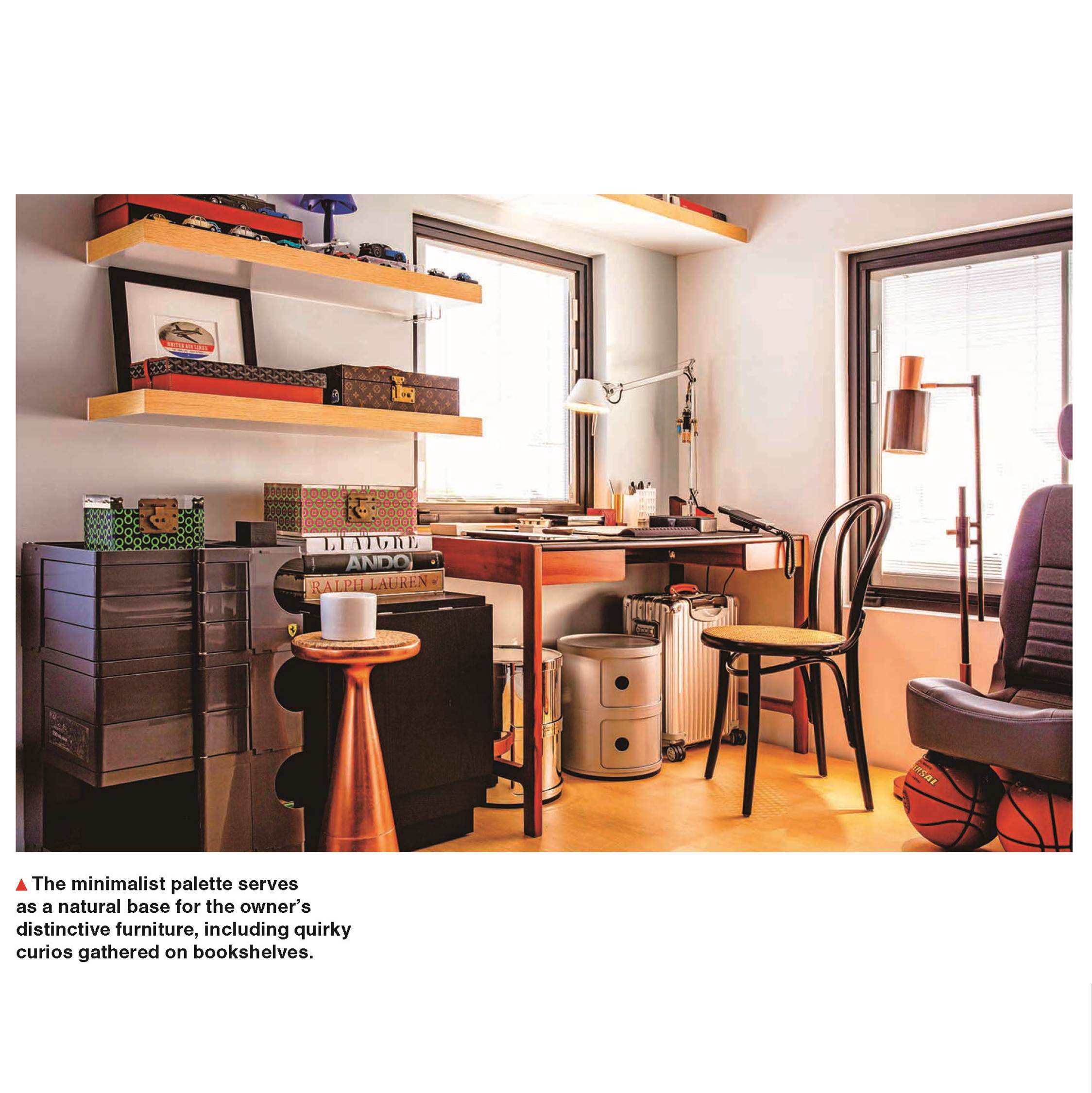 In this apartment in Convention Plaza in Wan Chai, to conceal the client’s audio-visual equipment in the cabinet behind the sofa, Clifton Leung installed an electrical motorized system. At the flick of a switch, a shelf accommodating the AV gadgets rises from the cabinet and they are ready to use.