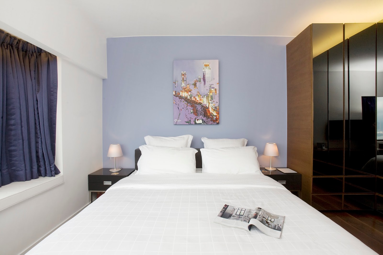 Here, calming colours of the blue, purple, brown and white are extracted from the painting to into the furnishings and furniture of the bedroom, giving the bedroom tranquility and serenity.