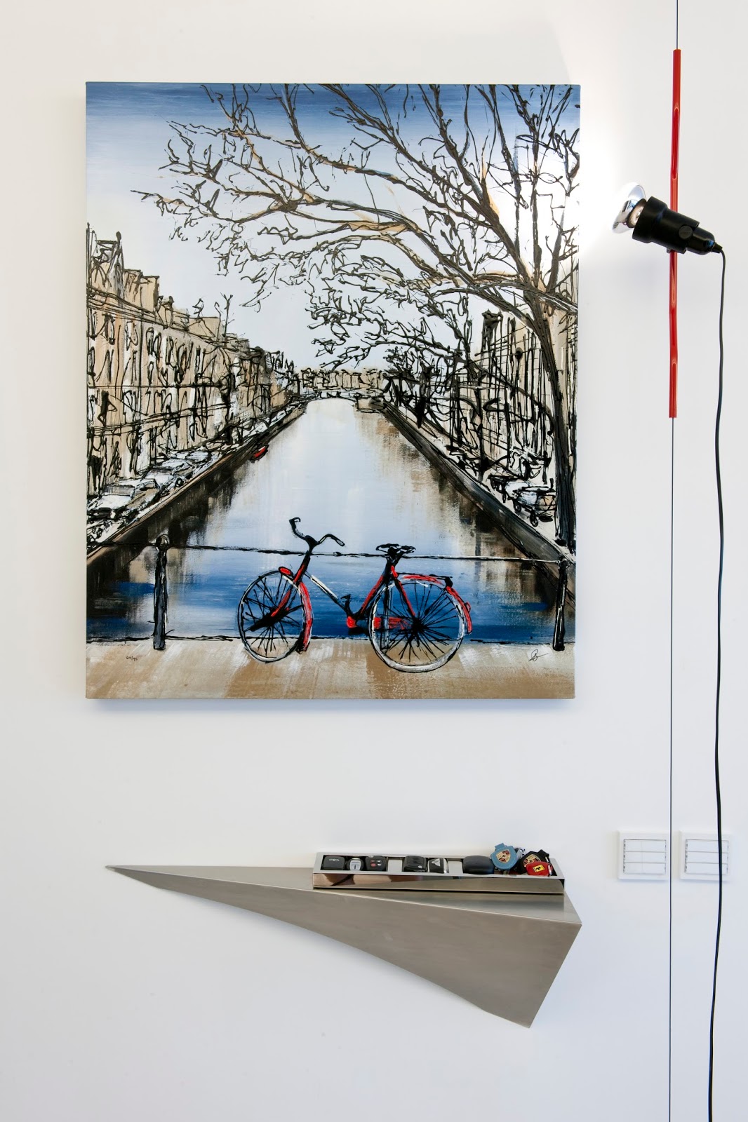 The entrance area of your home is perfect for an art piece, which gives you and your guests a perk-me-up every time you walk into your living space. Complemented by only a small shelf designed by Clifton and a statement lamp from Flos, this atmospheric painting by Paul Kenton is allowed to shine and get you thinking. Inspired by the wing of a stealth fighter jet, the shelf is contemporary, matches the travel theme of the art work, and provides a convenient pick-up/drop-off place for small items.