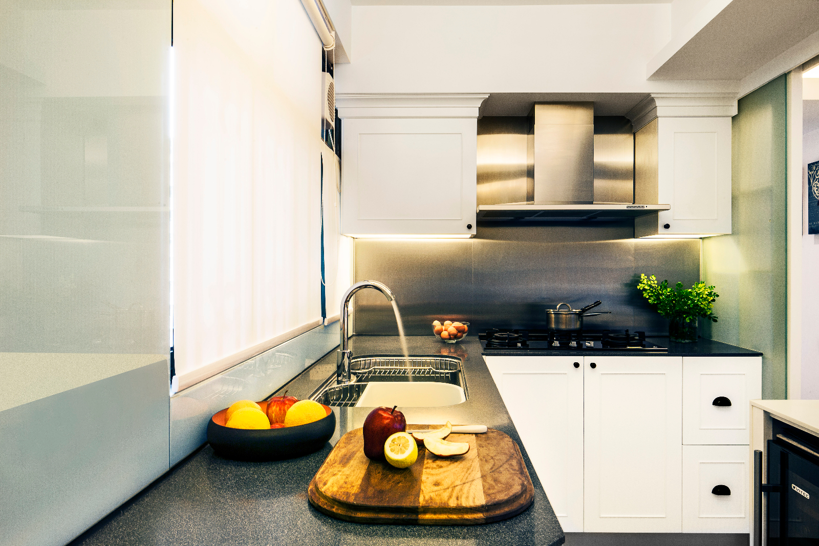 By having a simple white colour scheme, you can play up the accents and details such as the black knobs and details on the cabinets in this kitchen. The countertop and units are designed by Clifton Leung Design Workshop.