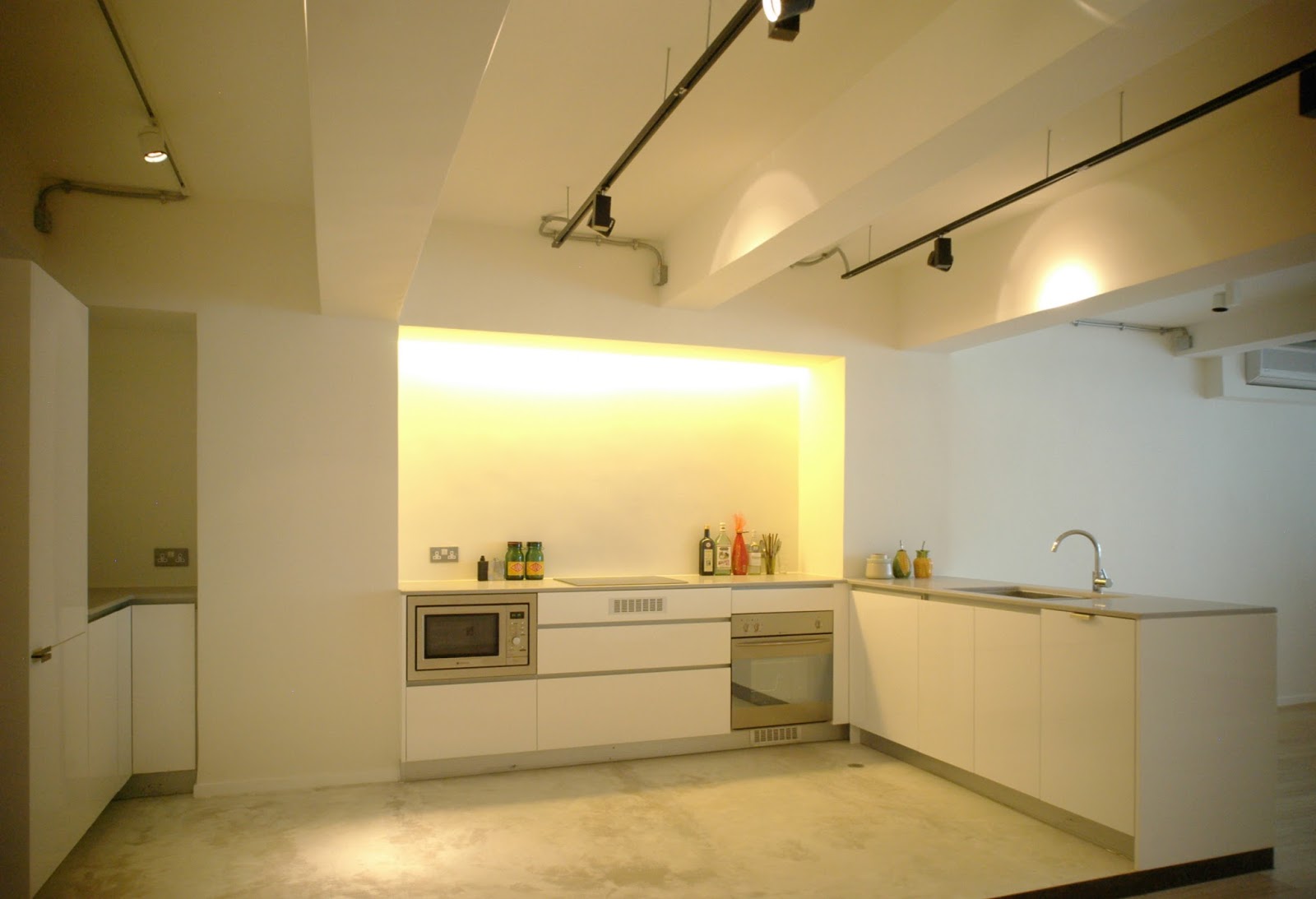 If you like stainless steel appliances, a white kitchen is perfect for showcasing these kitchen tools, such as in the exhaust hood, sink accessories and pot in this kitchen. The tap is from Galaxy Bathroom.